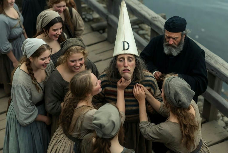 Credit where it's due — this has genuine atmosphere. The muted period-appropriate color palette, the weathered wood of the dock, the convincing variety in the peasant dresses, even the theatrical cruelty on the girls' faces as they mock the dunce. It reads like a still from a BBC historical drama. The central figure's pathetic expression sells genuine humiliation, and the bearded elder in black adds gravitas to the scene. But look at the hands converging on the dunce's neck and chin. Count the fingers reaching toward his face from the lower right — they emerge from sleeves belonging to bodies that don't quite resolve into distinct people. The blonde girl's hand cups his chin while another set of fingers materializes from approximately the same anatomical space. And the girl in the far back left has a face that's more suggestion than structure, features sliding sideways like she's mid-teleport. The 'D' on the dunce cap is suspiciously crisp compared to the weathered paper it's printed on — it has the confidence of a font, not handwriting.
