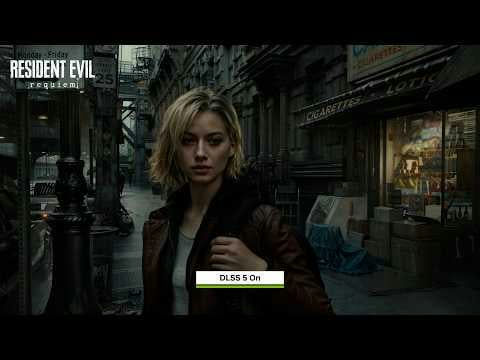 What we have here is a fake screenshot for a nonexistent Resident Evil game, complete with NVIDIA branding to give it that veneer of legitimacy. The woman's face has that telltale AI smoothness — porcelain skin that exists in no actual game engine, hair that flows in painterly strokes rather than rendered strands. She's been composited into a street scene that can't decide if it's a photograph or concept art. The background is a masterclass in AI confusion. That 'CIGARETTES' sign bleeds into whatever 'LOTIS' is supposed to be — letters that almost form words but dissolve under scrutiny. The storefronts have that familiar AI disease where architectural details suggest depth but lead nowhere coherent. The lighting on her leather jacket doesn't match the ambient gloom of the street behind her. The 'DLSS 5 On' overlay is a nice touch of grift — DLSS 5 doesn't exist, and this isn't a game. It's a tech demo for nothing, a promise screenshot for vaporware, probably generated to farm engagement on a YouTube thumbnail.